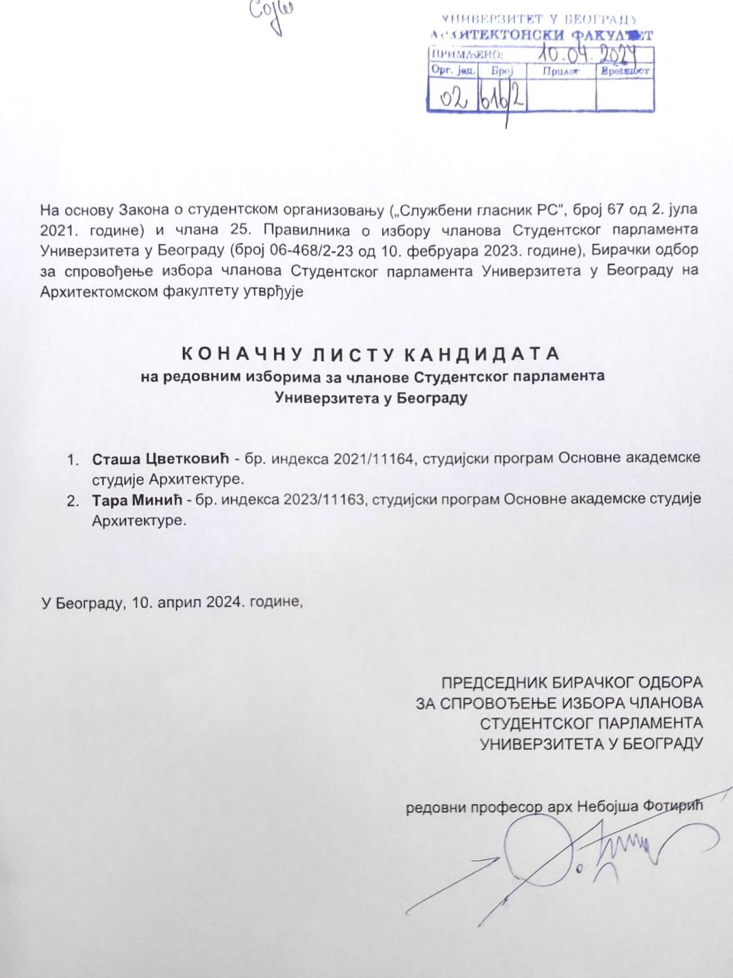 - Konačna lista kandidata na redovnim izborima za članove Studentskog parlamenta (10.04.2024.)