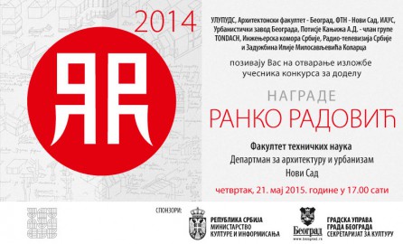 By Arhitektonski fakultet on 18/12/2014ULUPUDS - Udruženje likovnih umetnika primenjenih umetnosti i dizajnera Srbije, Arhitektonski fakultet u Beogradu, Fakultet tehničkih nauka u Novom Sadu, Institut za arhitekturu i urbanizam Srbije, Urbanistički zavod Beograda, Potisje Kanjiža A.D. - član grupe TONDACH, Inženjerska komora Srbije, Radio-televizija Srbije i Zadužbina Ilije Milosavljevića Kolarca pozivaju Vas na svečanu dodelu Nagrade Ranko Radović koja je osnovana sa ciljem da podstiče, razvija i afirmiše kritičko-teorijsku misao u oblasti arhitekture i arhitektonsko stvaralaštvo... -