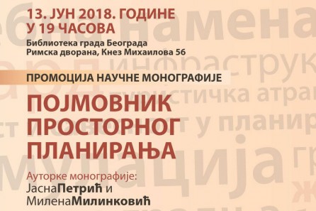 By Arhitektonski fakultet_Urednik on 08/06/2018/ 13.06.2018. u 19.00 / Pozivamo vas da nam se pridružite na promociji naučne monografije „Pojmovnik prostornog planiranja“, autorki Jasne Petrić i Milene Milinković. Izdavač monografije je Institut za arhitekturu i urbanizam Srbije, Beograd, 2017. godine. Promocija će biti održana u Rimskoj dvorani Biblioteke grada Beograda, Knez Mihailova 56, u sredu, 13. juna 2018. godine sa početkom u 19.00 časova. -