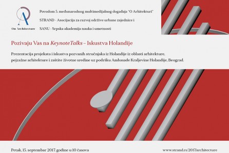 By Архитектонски факултет_Уредник on 12/09/2017/ 15.09.2017. у 10.00 / У оквиру 5. међународног мултимедијалног догађаја “О Архитектури 2017″ у петак, 15. септембра 2017. године, у свечаној сали Српске академије наука и уметности, Кнез Михаилова 35 у Београду, одржаће се презентација пројеката и искустава позваних стручњака из Холандије из области архитектуре, пејзажне архитектуре и заштите животне средине... -