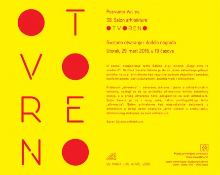 By Arhitektonski fakultet on 01/04/2016Ovogodišnji Salon arhitekture održava se od 29. marta do 30. aprila 2016. godine u Muzeju primenjene umetnosti (Vuka Karadžića 18). U osnovi ovogodišnje teme Salona „Otvoreno“ stoji pitanje „Čega smo to svedoci?“. Namera Saveta Salona arhitekture je da se javno aktuelizuje pitanje pritiska na svet arhitekture koji uzrokuje opštu dezorijentisanost, konformizam, partikularizam, anarhizam i nihilizam struke... -