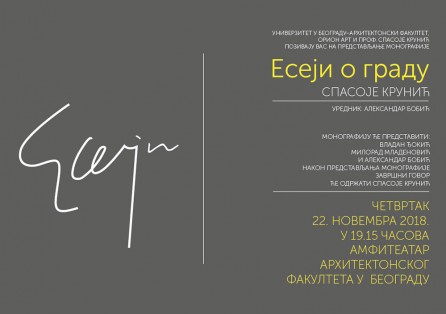 By Arhitektonski fakultet_Urednik on 20/11/2018/ četvrtak, 22.11.2018. u 19.15 / Pozivamo vas da nam se pridružite na predstavljanju monografije našeg profesora: "ESEJI O GRADU" - Spasoje Krunić u četvrtak, 22. novembra 2018. godine u 19.15 časova, amfiteatar Arhitektonskog fakulteta u Beogradu. -